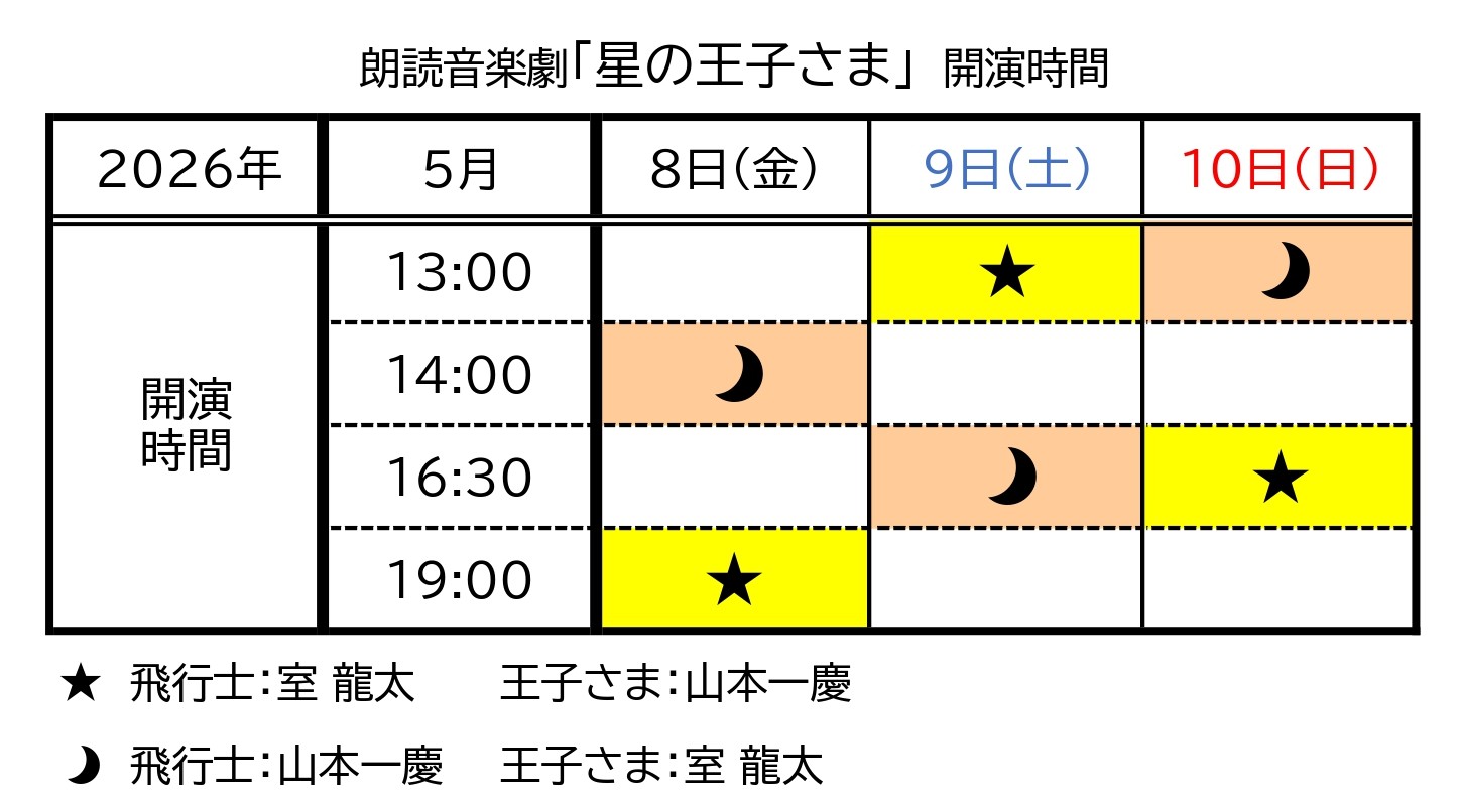 出演は、様々な舞台作品で多彩なキャラクターを演じ確かな表現力で評価が高い室 龍太と、シェイクスピア作品・ミュージカル・現代劇・2.5次元作品まで幅広いジャンルの舞台で活躍中の山本一慶が、飛行士と王子さまを、交互に演じ分けます。